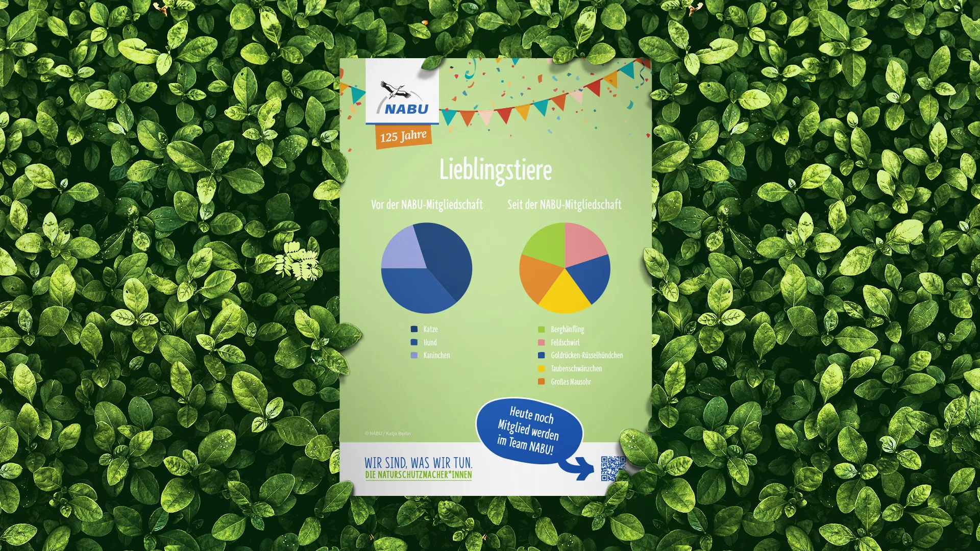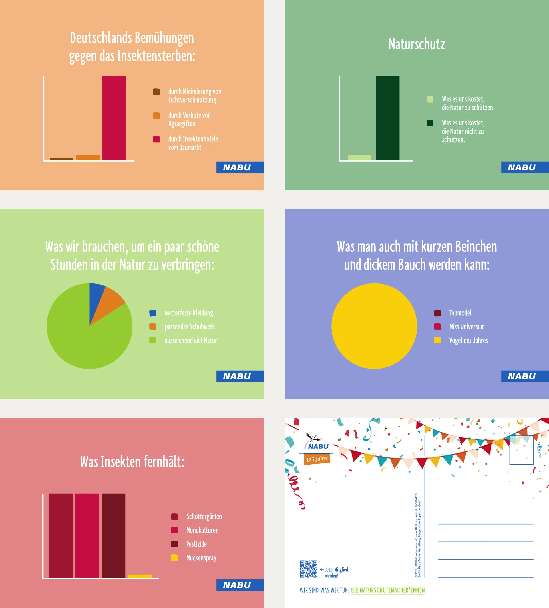 Die Jubiläums-Grafiken und Postkarten waren für uns ein besonderes Highlight. Wir durften die Ideen der wunderbaren Katja Berlin („Torten der Wahrheit“) im NABU-Design umsetzen. Entstanden sind eine lebendige, bunte und ebenso witzige wie wahre Postkartenserie und Editorial Designs zum 125-jährigen NABU-Jubiläum.